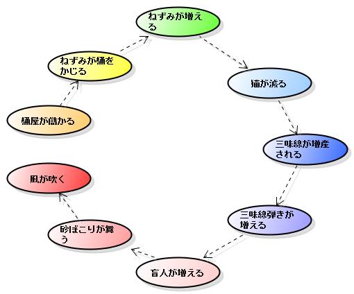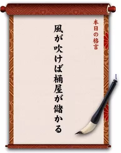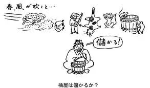 说的是古时候一吹风就很多沙尘(因为当时还没有水泥路嘛)→ 眼睛不好的人就会增加 → 然后演奏乐曲的人就会增加(当时眼睛不好的人经常就靠演奏乐曲谋生,有点像中国拉二胡的) → 为了演奏乐器会增加乐器(当时流行的是三味线,用猫皮做的) → 为了增加乐器就会多捕猫 → 老鼠增加 → 老鼠挠桶 → 修/卖桶的就赚了