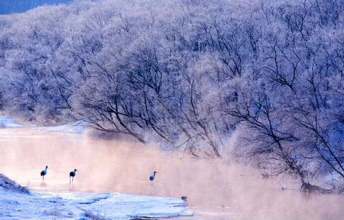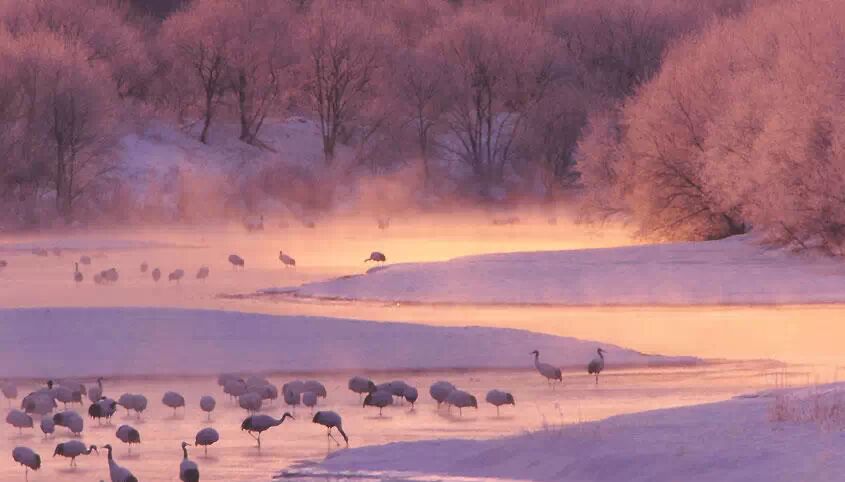 鹤,又名仙禽,自古以来就是益寿延年的象征,丹顶鹤性情高雅,姿态美丽,自有仙风道骨的品性。鹤居村,因鹤栖居而得名,冬日的清晨,东方泛白,溪面上升起浓浓白雾,上千只在此越冬的丹顶鹤自缭绕烟雾中醒来,舒展羽毛,翩然起舞。远眺无边无际的旷野,眼前是清灵鹤舞,足以忘却尘世的一切烦恼,独留内心的安定与清宁。