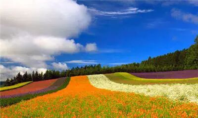 美瑛是在大片丘陵上长成的一个田园牧歌式的色彩小镇,地形起伏柔缓,如波浪般层层推开的花田美不胜收。重重丘陵间,一条条铺开的花道分成了层层明艳的色彩,花开繁盛之境,有如上帝绘画时不小心倾倒了手中的调色盘,恰恰落下凡间,掉在了美瑛的土地上。广阔田园,处处美景,租一辆单车,沿途都是最好的风景。路遇青池,蓝色池塘像画布一样,美得让人惊叹。柯南某集剧场版片尾曲的取景就是这儿哦~